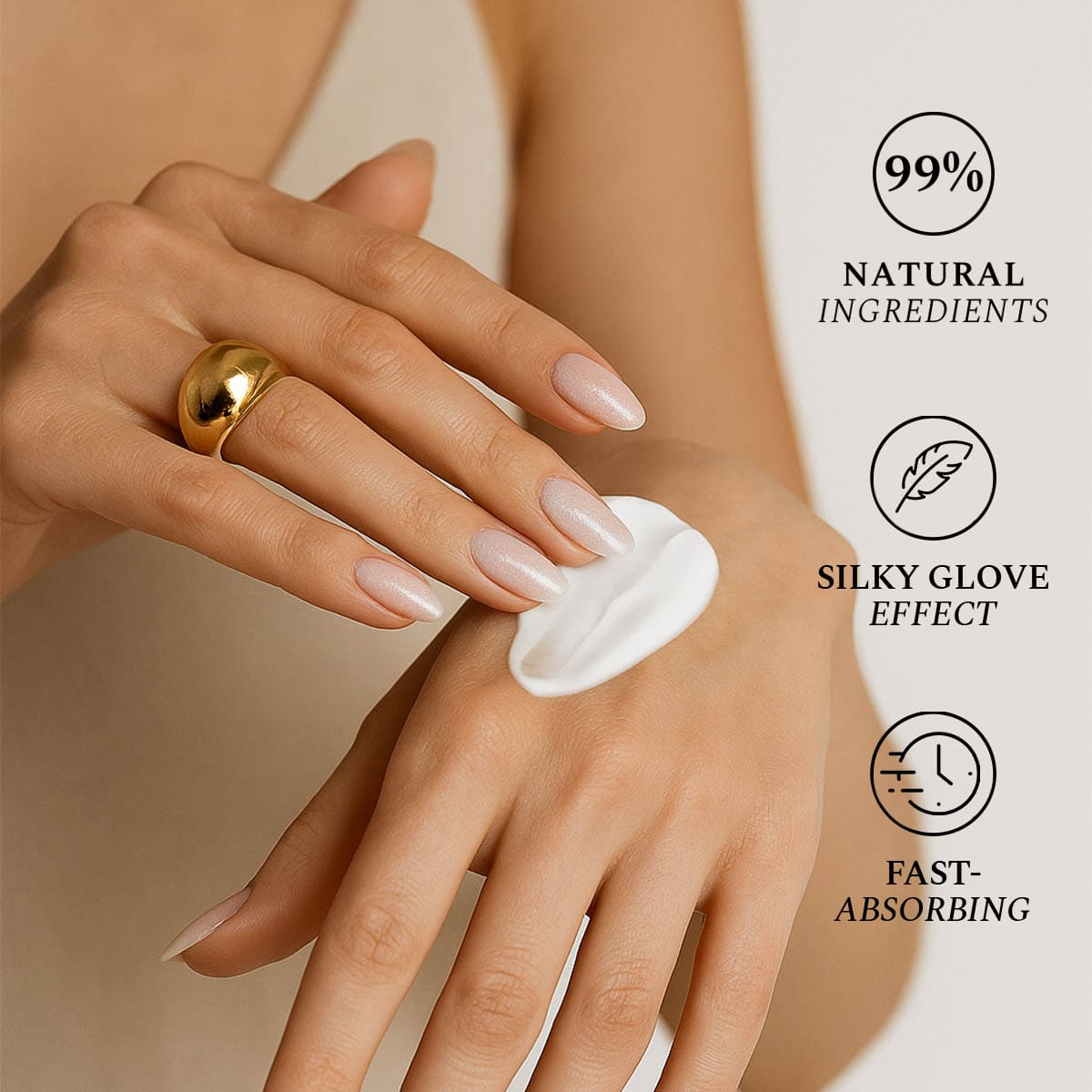 The formula supports the skin's natural barrier with 99% natural ingredients, leaving it smooth, replenished, and free from stickiness or residue. After application, the skin feels delicately protected — as if wrapped in soft, comforting gloves.