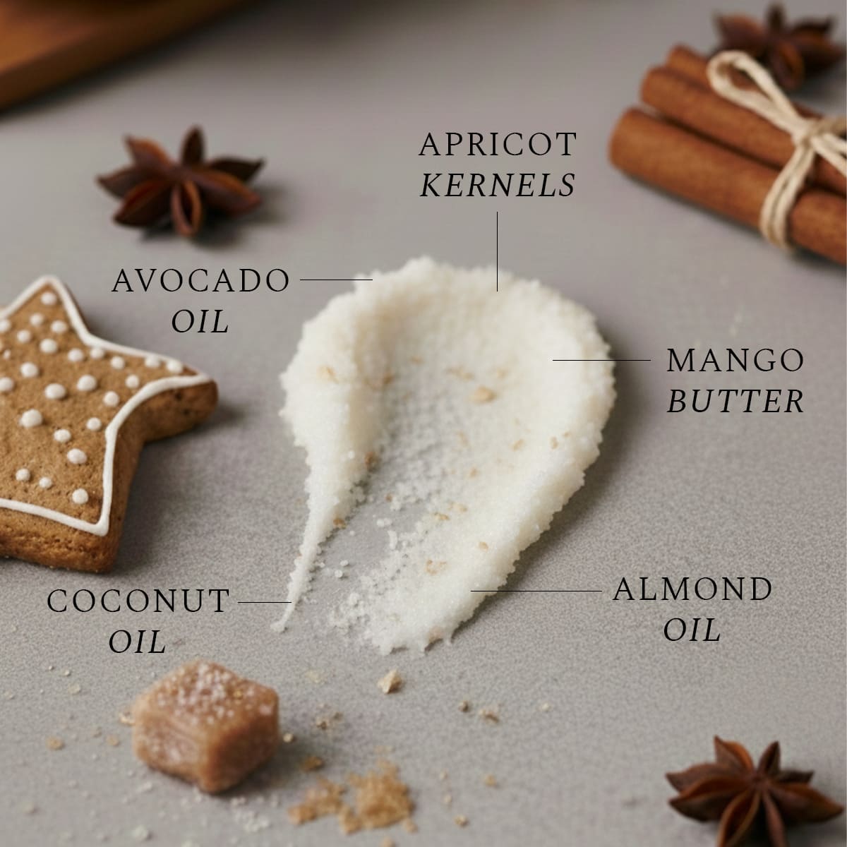 A soft wave of warm cookie notes, holiday spices, and caramelized sweetness greets the skin even before exfoliation begins.