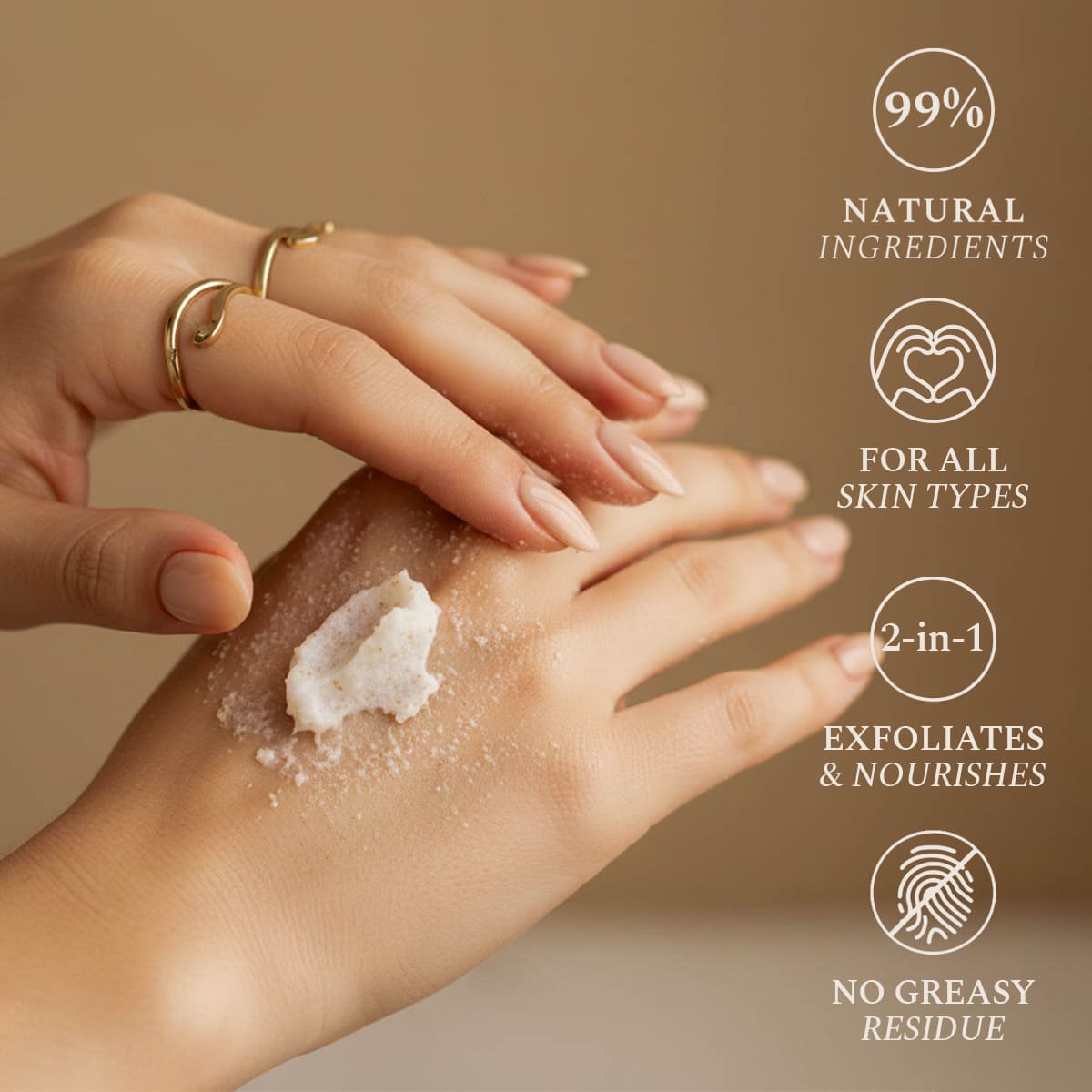 Infused with sugar crystals, finely ground apricot kernels, and a rich blend of oils and butters, this scrub gently polishes the skin while deeply nourishing it.