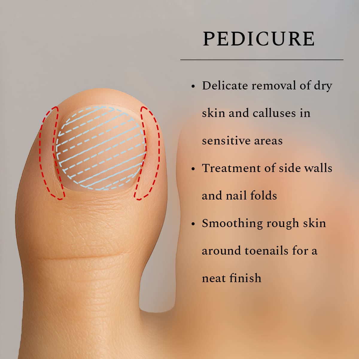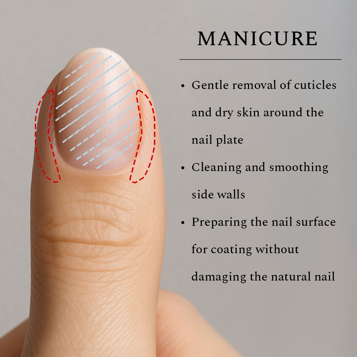 - Gentle removal of cuticles and dry skin around the nail plate