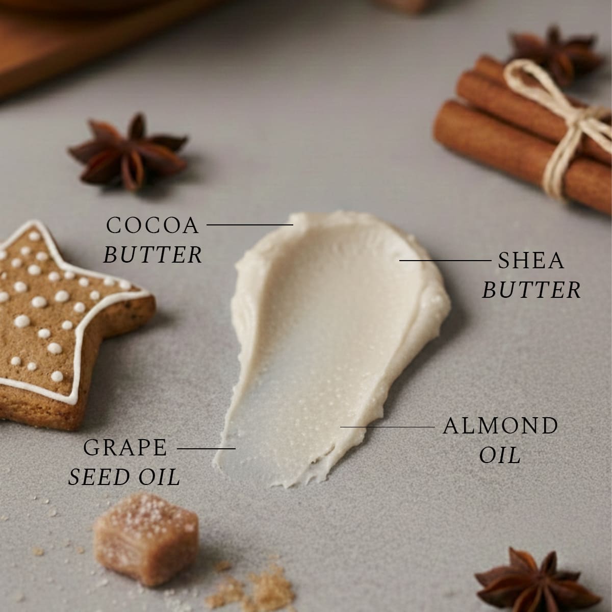 Butyrospermum Parkii Butter, Theobroma Cacao Seed Butter, Vitis Vinifera Seed Oil, Prunus Amygdalus Dulcis Oil, Hydrogenated Vegetable Oil, Helianthus Annuus Seed Oil, Olea Europaea Fruit Oil, Glycine Soja Oil, Parfum, Tocopheryl Acetate.